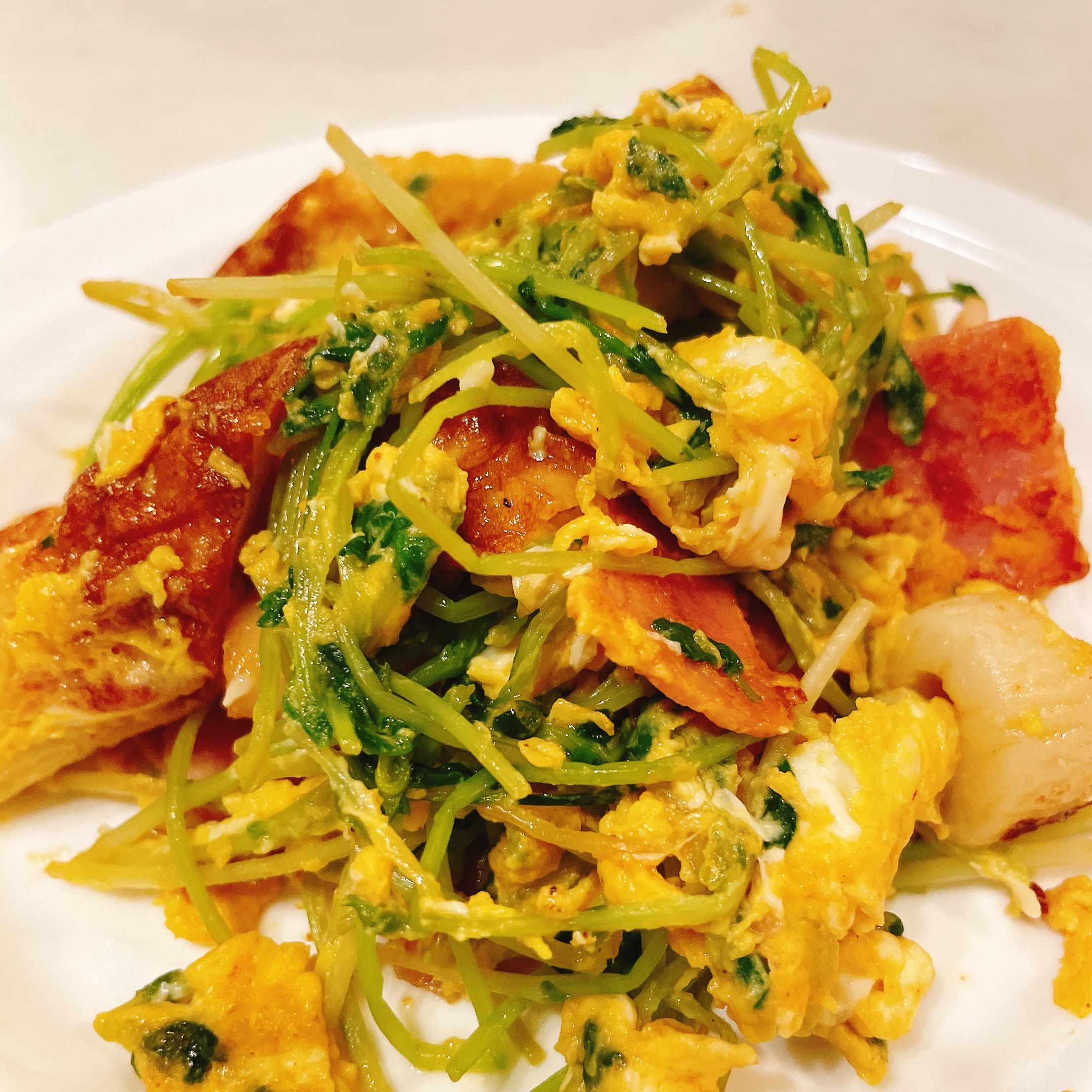 卵を加える際、あまり混ぜすぎず半熟の状態で火を止めると、ふわふわ食感が楽しめます。 - 豆苗のシャキシャキ感を活かす